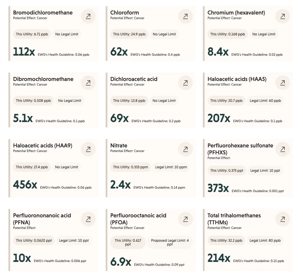 I looked up a utility near me, the Saint Paul Regional Water Service. There are all the chemicals that are over the limits EWG recommends…wow!